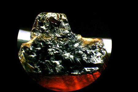 本实验室近来遇到一种被客户称为黝帘石的褐色宝石,一粒晶体原石和一粒由同种晶体切磨的椭圆刻面型宝石。晶体原石呈棕褐色,表面玻璃光泽,半透明;形状为柱状,表面有纵纹,裂隙发育,参差状至贝壳状断口,并可见一组完全解理;可见穿插双晶(见图1,图2)。