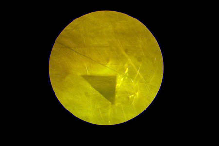 采用常规仪器鉴定表明:刻面型宝石的折射率为1.734-1.745;多色性明显,可见褐色、黄色、绿色;偏光镜下四明四暗,为非均质体;长短波紫外光下表现为荧光惰性;密度测试为3.38g/cm3;对该晶体进行放大检查可见管状包体、针状包体、三角形包体及不规则形的固态包体(见图3)。由此可初步确定此宝石为绿帘石。